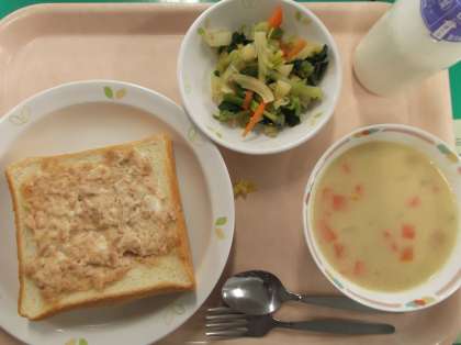 献立 ツナトースト コーンポタージュ じゃこサラダ 牛乳