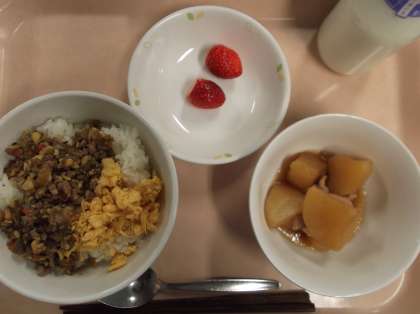 献立 大豆とごぼうのそぼろご飯 大根のべっこう煮 くだもの
