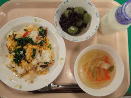 献立 菜の花ずし 沢煮碗 よもぎ白玉ぜんざい 牛乳