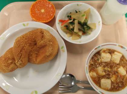献立 黄粉揚げパン シーホー豆腐 野菜のコチジャンだれ くだもの 牛乳