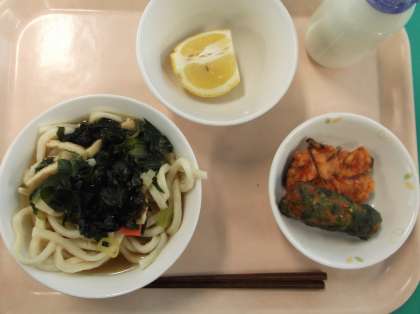 献立 あごだしうどん さくらえびのかきあげ ちくわのいそべあげ くだもの 牛乳