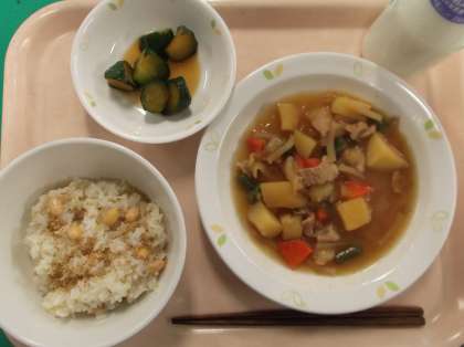 献立 五穀ご飯(大豆) 肉じゃが きゅうりの南蛮漬け 牛乳