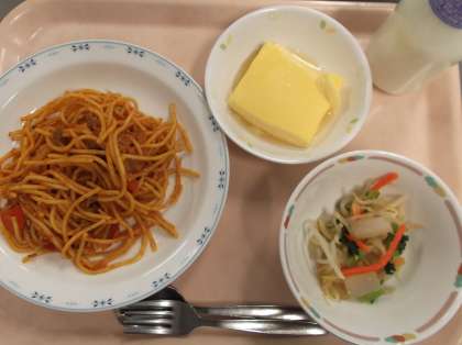 献立 スパゲティナポリタン こんにゃくサラダ プリン 牛乳
