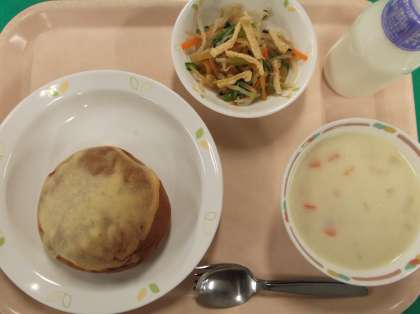 献立 ビスキュイパン じゃが芋のポタージュ 油揚げのサラダ 牛乳