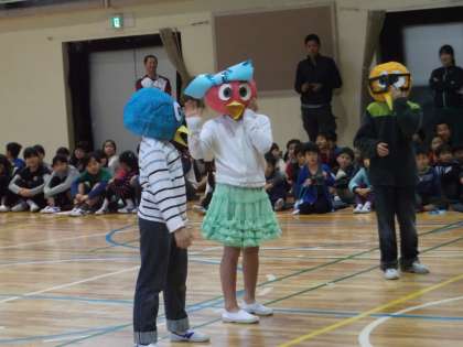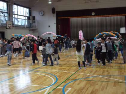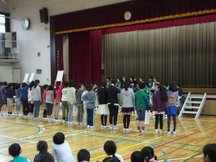 1年生を迎える会が行われました。各学年の出し物で歓迎の気持ちを表し、1年生からは歌のお礼がありました。中里小のマスコットキャラクターも登場して、みんなで1年生を歓迎しました。
