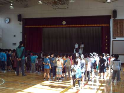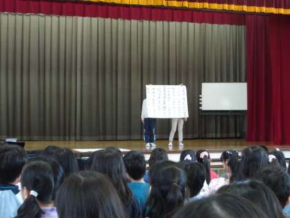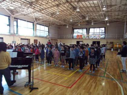 今年度最初の音楽集会は、27日開校記念集会で歌う、「ふるさと」と「ハッピーバースデーマイスクール」を歌いました