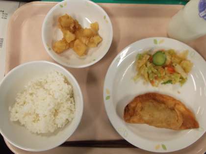 献立 ご飯 ジャンボ餃子 キャベツのごまサラダ じゃが芋の甘辛煮 牛乳