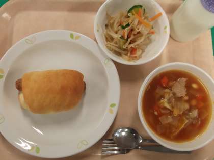 献立 ウインナーロールパン ミネストローネ こんにゃくサラダ 牛乳