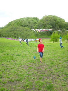 三・四年生がこどもの国へ遠足に来ました。こいのぼりがおよいでいる横の広場で遊んでいます。