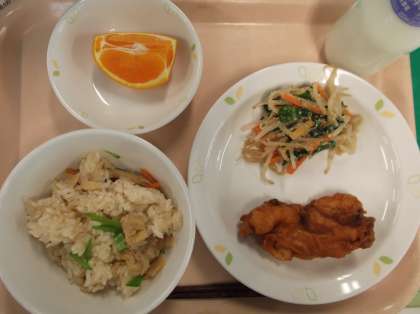献立 筍ごはん さめのフリッター 野菜のごま酢和え でこぽん 牛乳