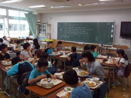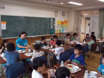 4月最後の給食。1〜3年生、みんな楽しそうに食べていました。先生も一緒に入って和気あいあいです!