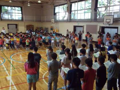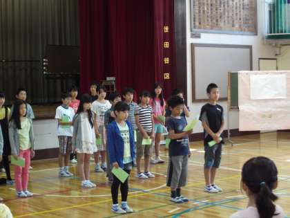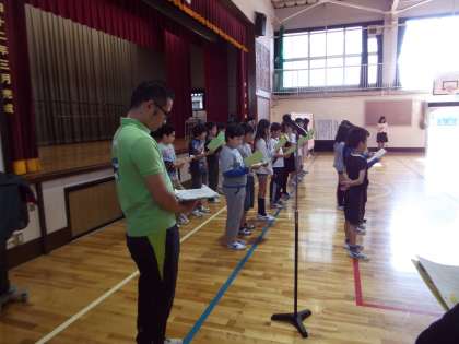 今年度初めての詩の朝会がありました。担当は6年生でした。(さすがは一野学級、先生のポロシャツの色と子どもたちがもっている詩のファイルの色が一緒!!)「雑草のうた」をみんなで元気に群読しました。玄関にも掲示してりますのでご覧ください。