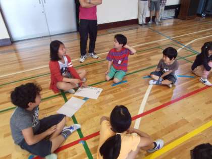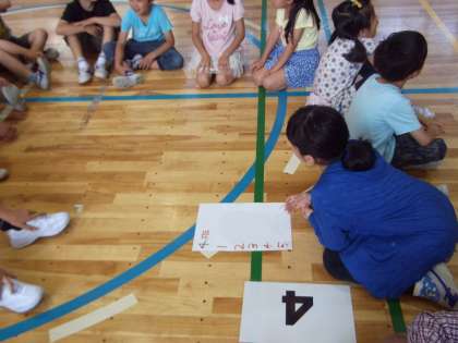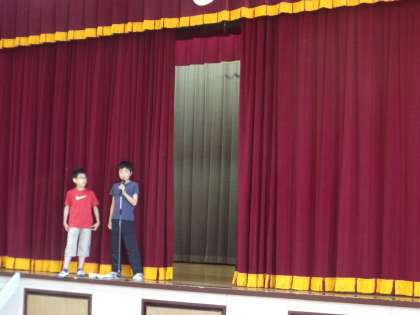たてわり班で集まって、舞台の上で何が飛んでいるのか?は考えました。車座になって6年生を中心に話し合い、答えを書いていました。これも、今年度の中里の柱、6年生の活躍場面を増やしたり、励ましたり、価値づけすることによって自尊感情を自己肯定感を高めたいと考えています。