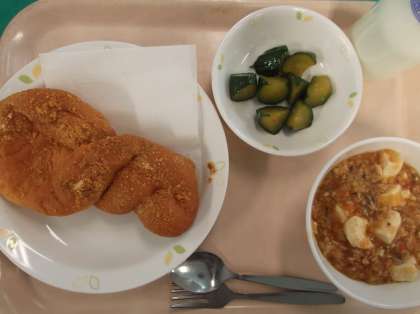 献立 きなこ揚げパン シーホー豆腐 ピリカラきゅうり 牛乳