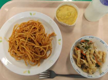 献立 スパゲティナポリタン 油揚げのサラダ ケークサレ 牛乳