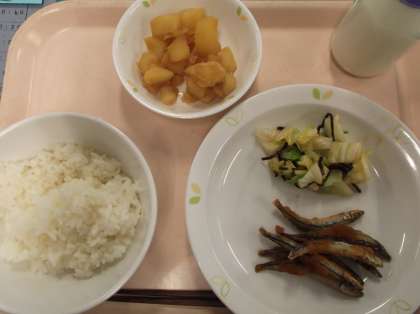 献立 ご飯 きびなごのバーベキューソース きゃべつの塩こんぶ じゃが芋の甘辛煮 牛乳