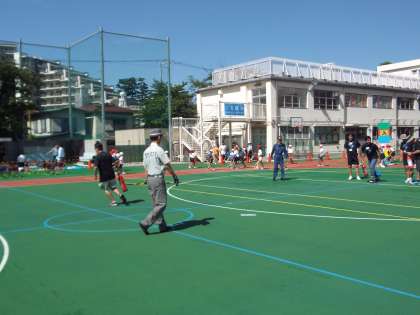 まもなく入場です。子どもたちは、椅子だしや係の準備です。世田谷消防署とおやじの会のコラボ競技の打ち合わせもばっちり!泉の学び舎の横断幕も初お目見えしています。