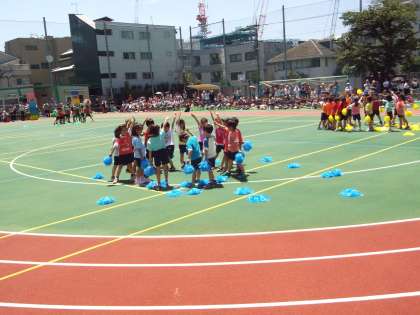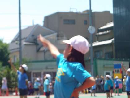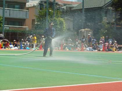 1,2年生と3,4年生の表現が終わりました。休憩時間には、世田谷消防署の方による水まきがありました。本物のホースによる水まきです。