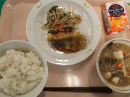 献立 ご飯 マーボー汁 魚の甘酢あんかけ ごま和え オレンジジュース