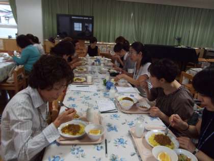 家庭教育学級さん主催の給食試食会が行われました。中里の給食の話を栄養士の本藤先生から伺ったあと、実際に給食を食べました。キーマカレーだったのですが、あまりのおいしさにおかわり続出!おかわりなのに、山盛り!!一年で一番楽しい会いう評判もあるほどです。準備大変だったと思いますが、ありがとうございます。テーブルの上にさりげなく飾られたアジサイとカタツムリ、素敵でした。