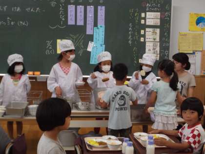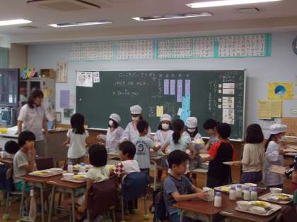 試食会を抜け出し、1年生の給食の様子を見に行ってみると・・・素晴らしい!みんな席について配膳を待っていました。配膳をする子たちも上手でした。あまりの成長ぶりにびっくり!!