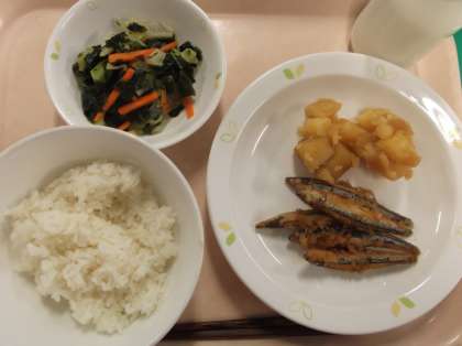 献立 ごはん きびなごの南蛮漬け わかめサラダ じゃが芋の甘辛煮 牛乳