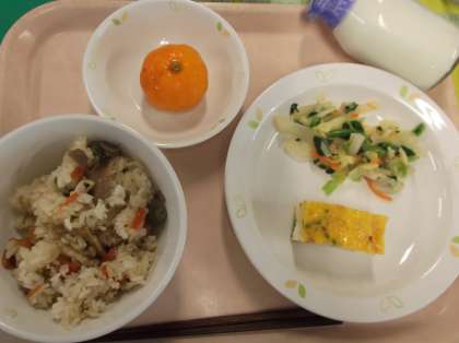 献立 鶏五目ご飯 ゴーヤの卵焼き みそドレサラダ 冷凍みかん 牛乳