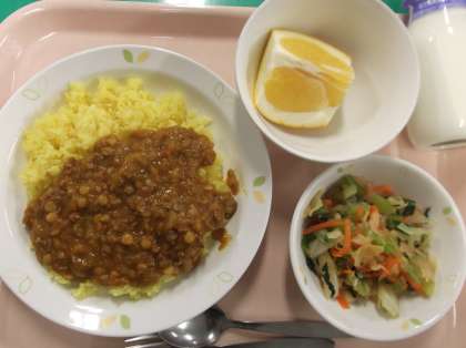 献立 キーマカレー 寒天サラダ みしょうかん 牛乳