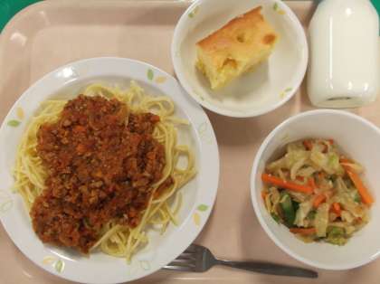 献立 ミートソーススパゲティ きゃべつとアスパラのごまサラダ パインケーキ 牛乳