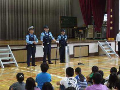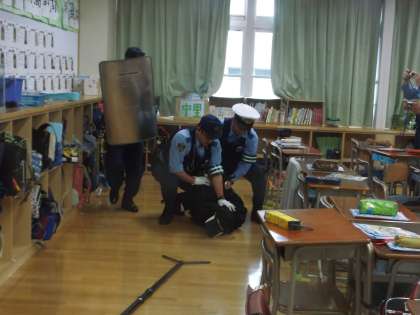 世田谷警察の協力を得て不審者訓練を行いました。訓練の後は、体育館で警察の方のお話を伺いました。