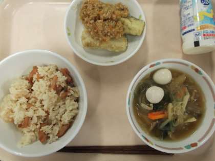 献立 たこめし 高野豆腐となすのみそそぼろ 春雨スープ ジョア