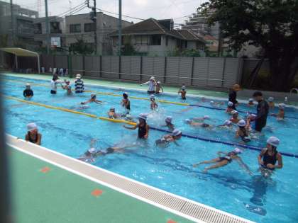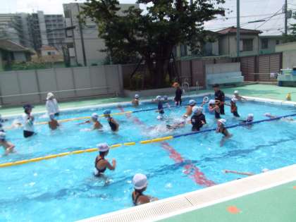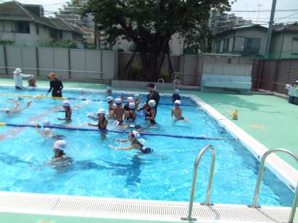 朝は少々雲行きが怪しかったですが、すっかり青空が戻ってきました。低学年の子たちは、宝拾いに夢中になっていました。気持ち良さそうですね。今週で、前期のプールは終わりです。たくさんの子の参加を待っています。
