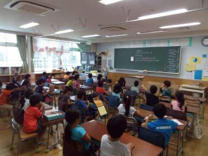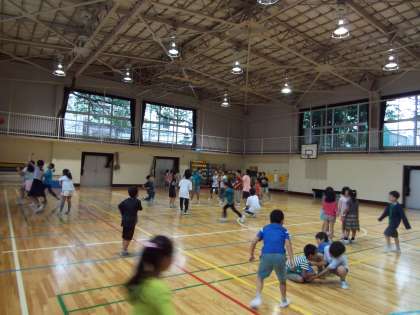 久しぶりに先生やクラスメイトと顔を合わせて、みんな楽しそうでした。あいにくの雨だったので、中休みは体育館で1年生と6年生が遊んでいました。