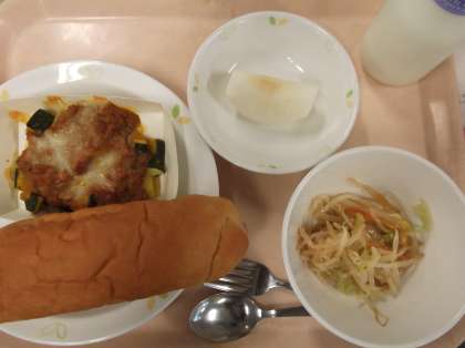献立 くろざとうパン 夏野菜のグラタン もやしサラダ なし 牛乳