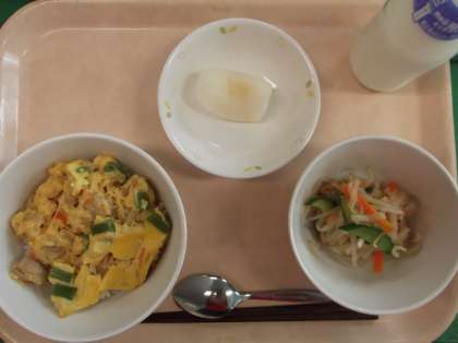 献立 親子丼 かみかみ塩ナムル 梨 牛乳