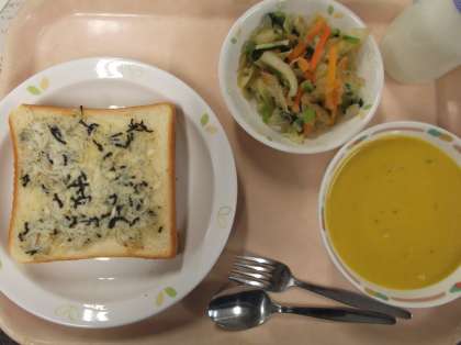 献立 しらすトースト かぼちゃのポタージュ 糸寒天サラダ 牛乳