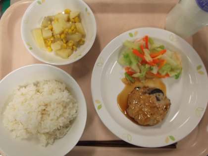 献立 ごはん 秋茄子バーグ ひとしお野菜 コーンポテト 牛乳