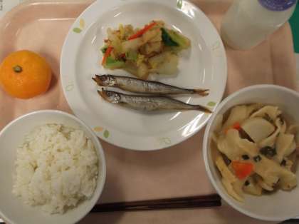 献立 ごはん ししゃも焼き 白菜のポン酢あえ 団子汁(大分県の料理)みかん 牛乳