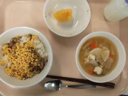 献立 大豆とごぼうのそぼろごはん 豚汁 果物 牛乳