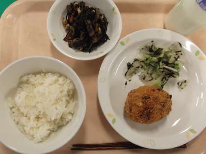 献立 ごはん じゃが芋コロッケ 磯和え ひじきの煮物 牛乳