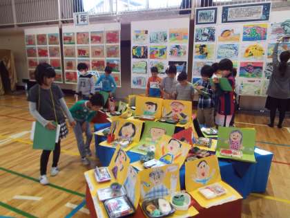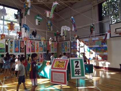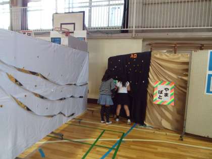 各学年のコーナーを紹介します。やまばと学級、1年、2年。やまばと学級のコーナーの中は、ブラックライトで宇宙を演出しています。昨日の学校日記をごらんください。