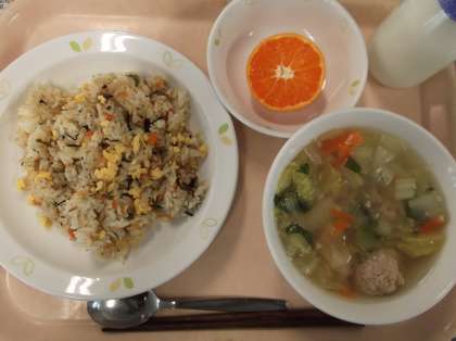 献立 ひじきチャーハン 肉団子のスープ くだもの 牛乳