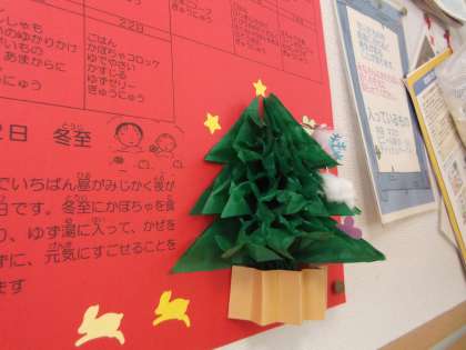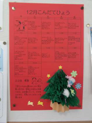 今月の献立表には、クリスマスツリーが!各クラスの教室やランチルームに掲示しています。
