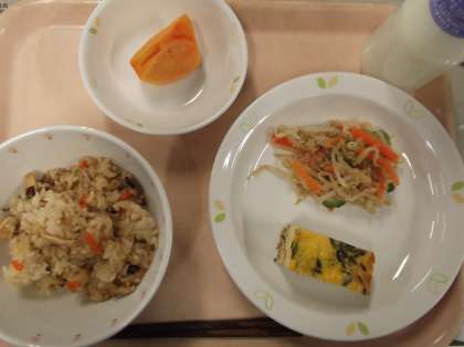 献立 こぎつねごはん ひじきの卵焼き 野菜のごま酢和え 柿 牛乳