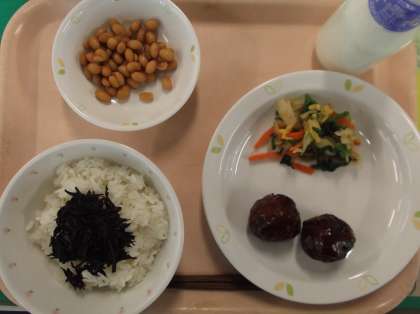 献立 ごはん ひじきふりかけ 飛び魚の肉団子 白菜のポン酢あえ ぶどう豆 牛乳