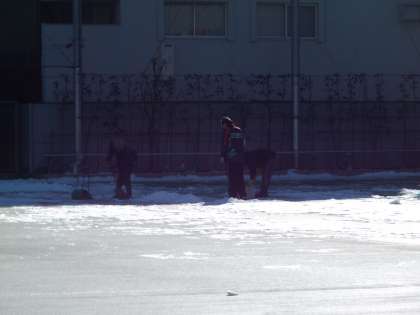 昨日の雪から一転、今日は太陽がまぶしいです。グランドの日陰の部分は、なかなか雪が溶けないので、主事さんたちが雪かきをしてくれました。