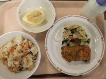 献立 かやくごはん さめの青のりフリッター じゃこサラダ はるか 牛乳