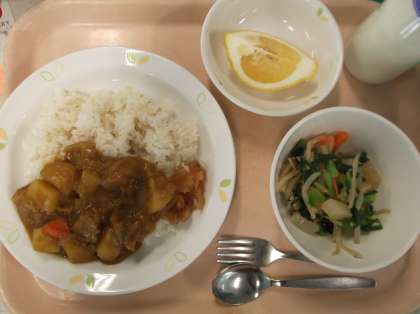 献立 カレーライス 福神漬け こんにゃくサラダ くだもの 牛乳