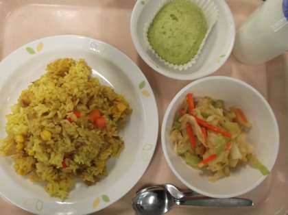 献立 カレーピラフ きゃべつのごまサラダ 若草蒸しパン 牛乳