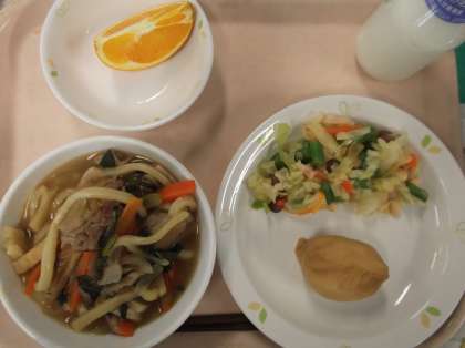 献立 いなりずし 煮込みうどん 豆のサラダ ネーブルオレンジ 牛乳